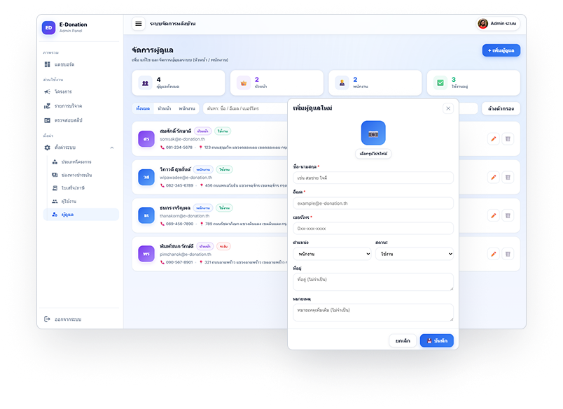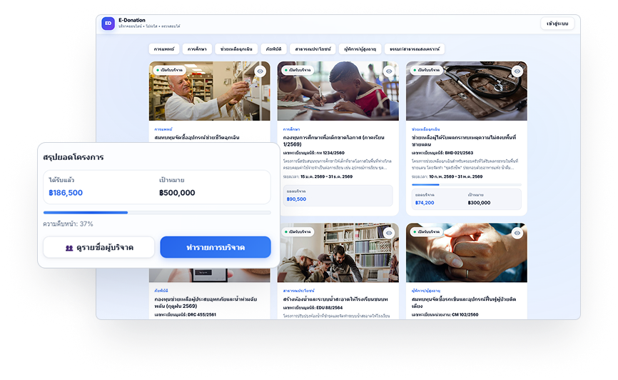 E-Donation Platform ยกระดับการรับบริจาคด้วยระบบที่ทันสมัย ปลอดภัย และพร้อมใช้งานจริง บนแพลตฟอร์ม E-Donation Platform ที่ออกแบบมาเพื่อรองรับการบริจาคในยุคดิจิทัลอย่างครบวงจร